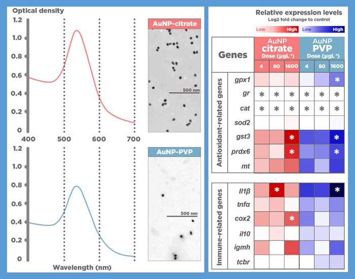 Les dades obtingudes van mostrar que les brànquies del peix podrien ser un target important per les nanopartícules transmeses per l’aigua. Els dos revestiments van generar diferents patrons d’expressió, induint un augment en els nivells de mRNA de gens antioxidants i inflamatoris, encara que també es va observar la supressió d’altres gens codificants per enzims antioxidants. D’aquesta manera, les dades mostren que les nanopartícules d’or poden alterar l’estat oxidatiu a les brànquies però els punts finals associats amb el dany haurien de ser quantificats permetent una comprensió més profunda del seu impacte i el seu grau de perillositat.