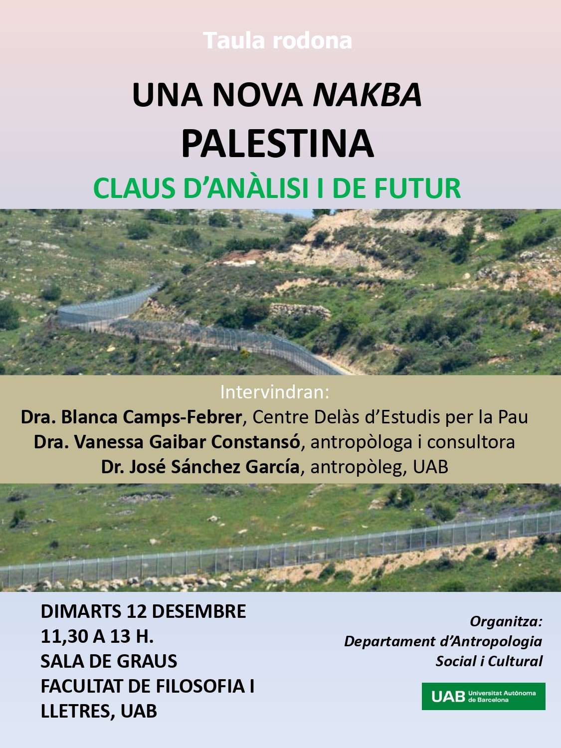 Dimarts, 12 de desembre a les 11.30 h. a la Sala de Graus, en el marc de l'assignatura Seminari d'Aplicacions de l'Antropologia i Anàlisi de Polítiques d'Intervenció Social, s'organitza aquesta Taula Rodona com a acte de reflexió, discussió i condemna de la catàstrofe humanitària de la guerra de Gaza.